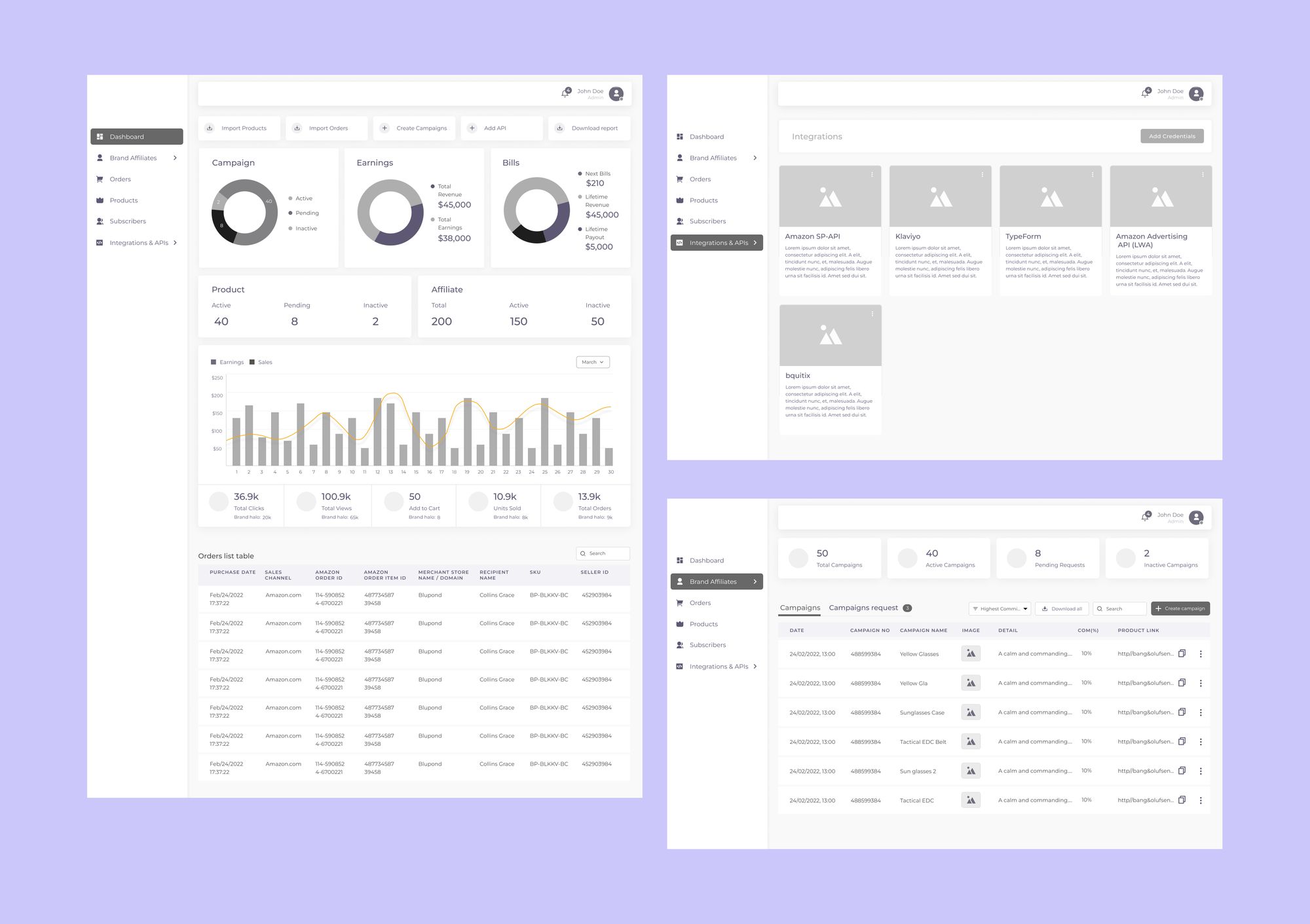 The dashboard serves as a centralized hub, presenting a concise overview of sales analytics. It highlights key metrics, such as the total number of active campaigns an affiliate is engaged in, overall revenue, and earnings. Additionally, the dashboard features insightful charts illustrating earnings and sales statistics, covering total clicks, views, add-to-cart items, units sold, and total orders.