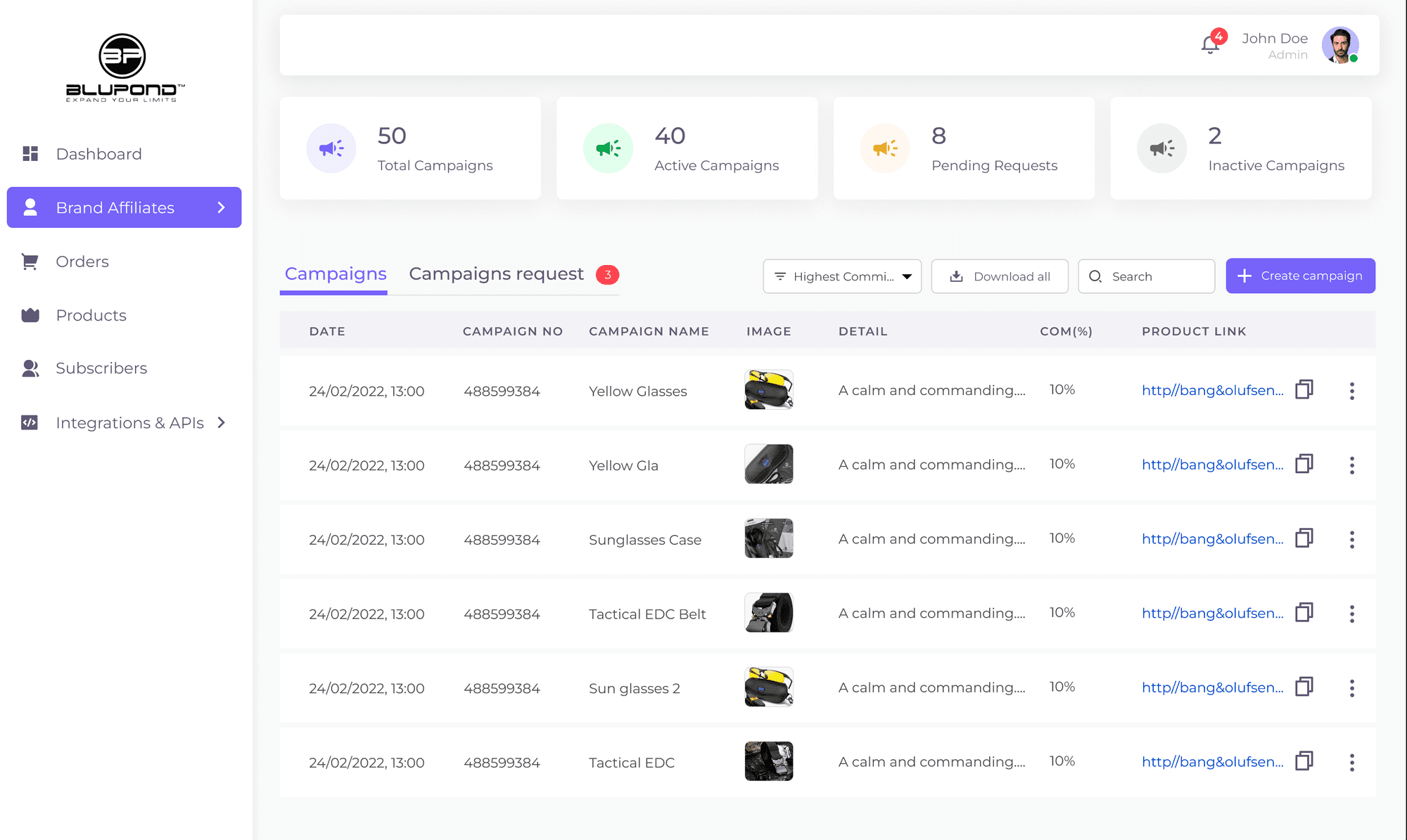 The product campaign section serves as a curated list of products the brand desires affiliates to promote. This dedicated page encompasses campaign analytics, active campaigns, and a catalog of campaign requests initiated by affiliates expressing interest in promoting specific campaign programs.