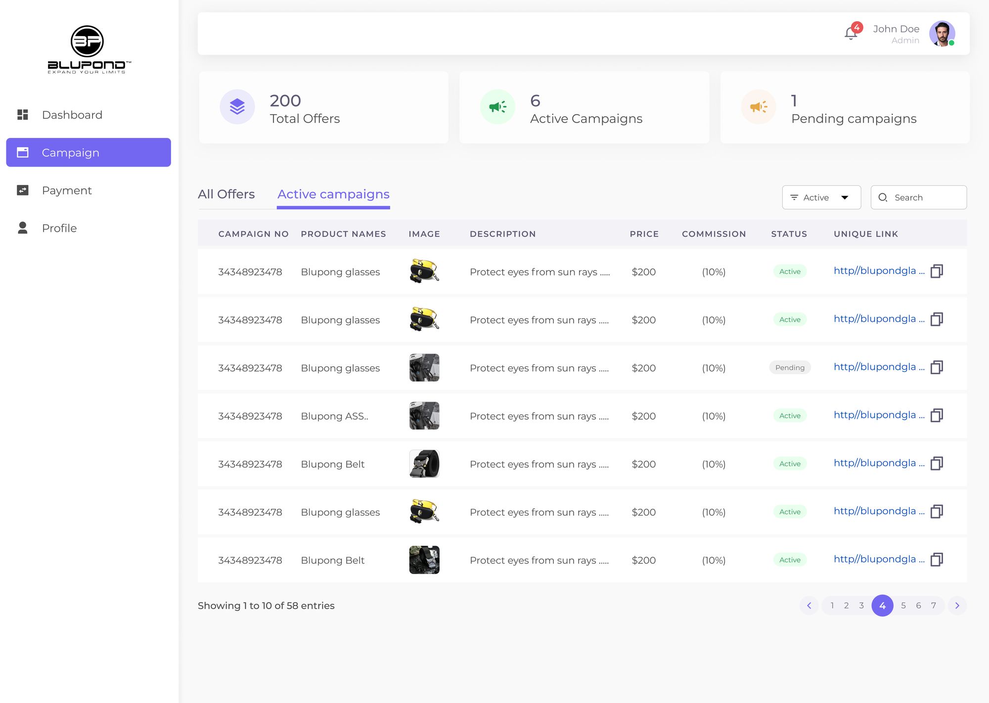 The campaign page provides comprehensive campaign analytics, presenting both active and pending offers, as well as active and pending campaigns. A dedicated table showcases available offers for affiliates to apply for, while an active campaign section displays the list of offers that the affiliate has accepted. This ensures a clear and organized overview of the affiliate's involvement in various campaigns.