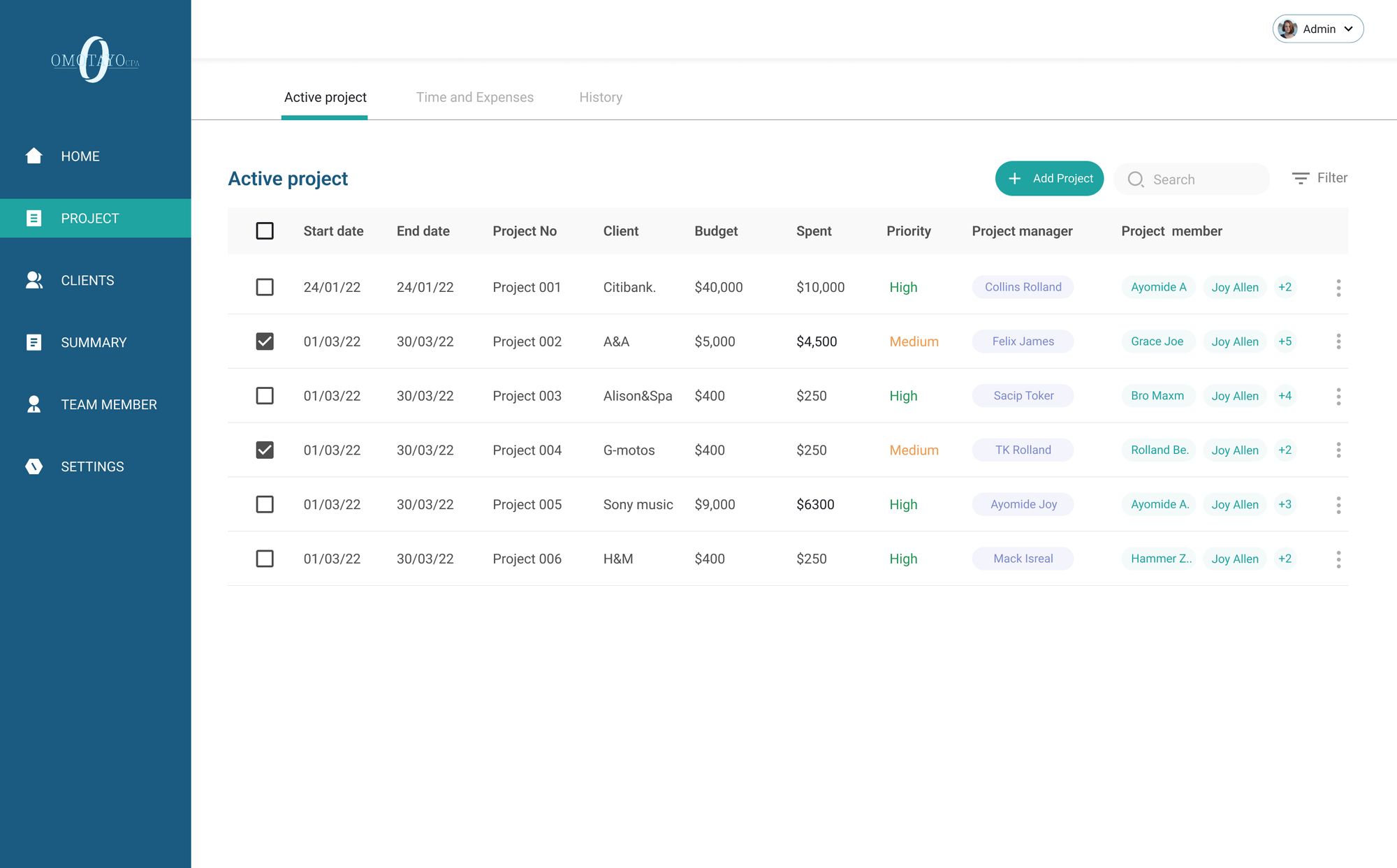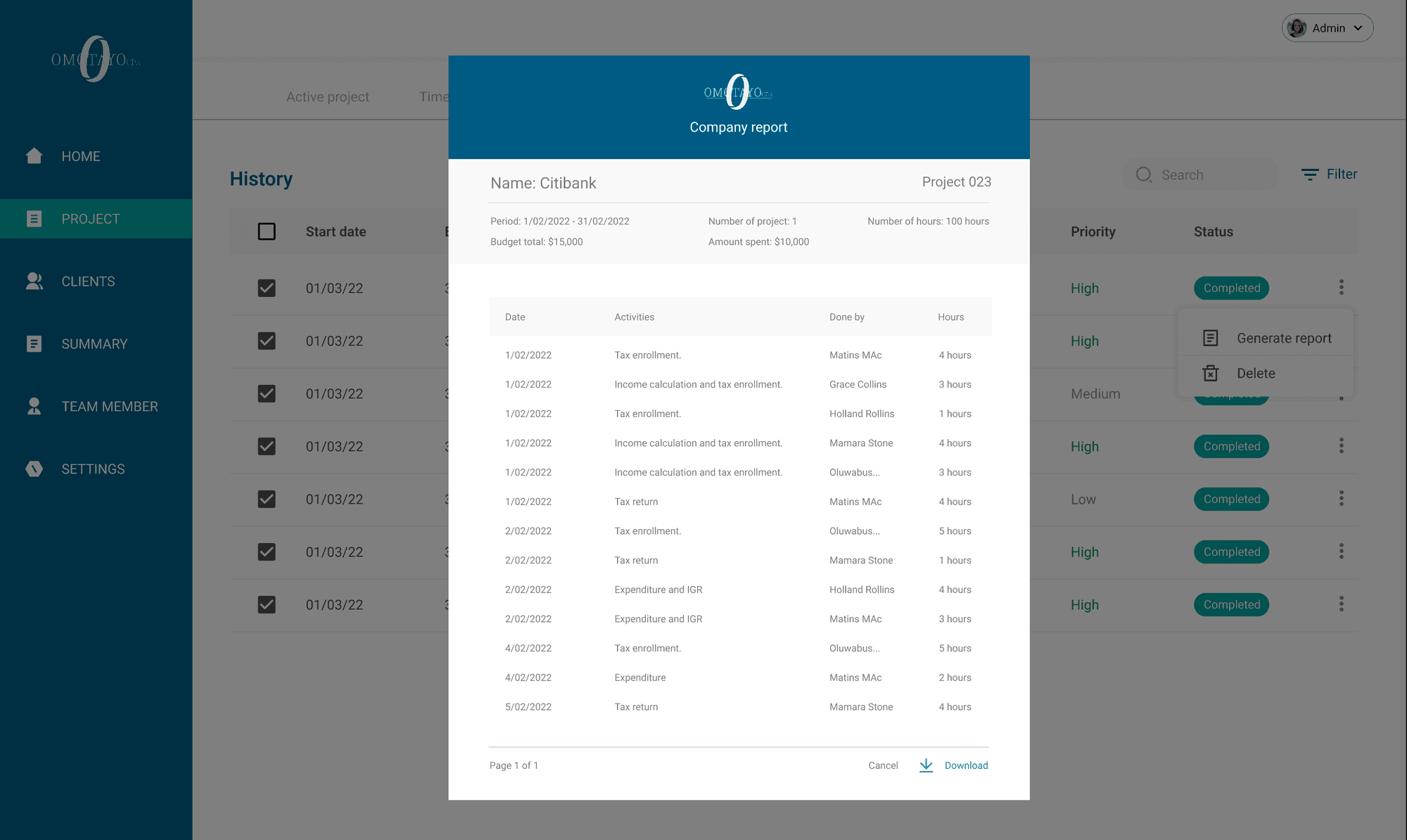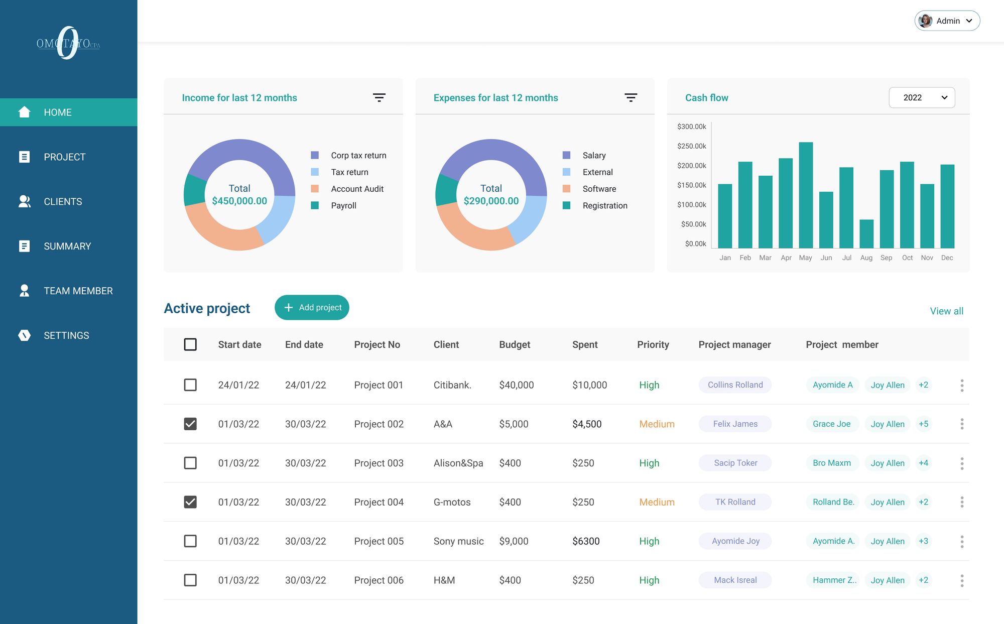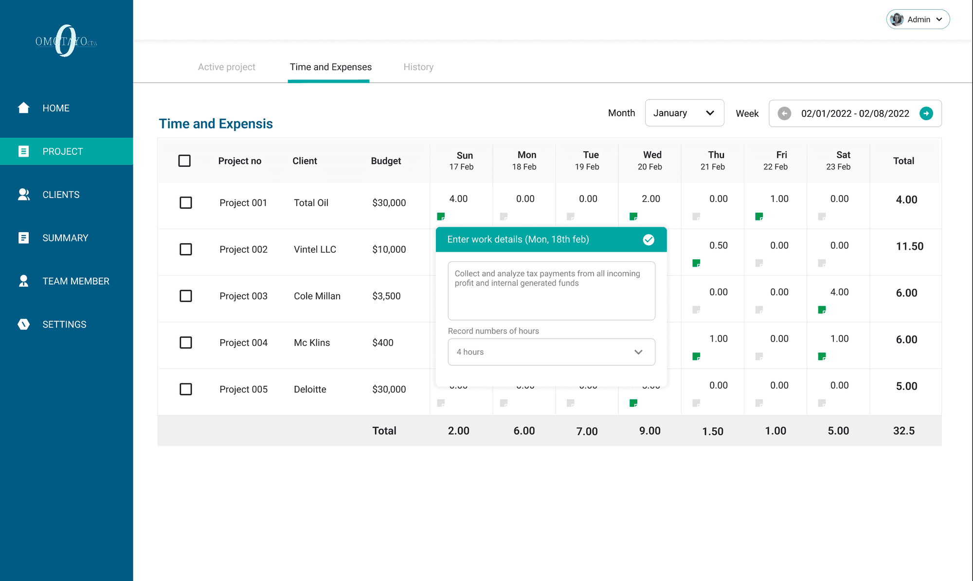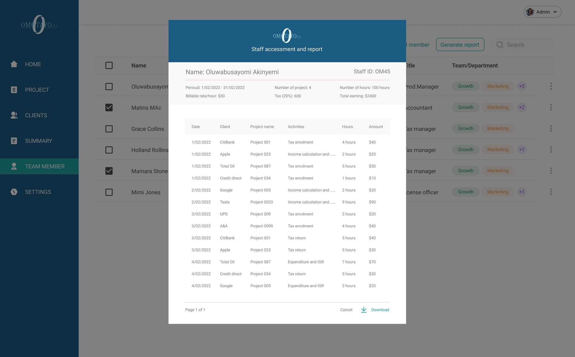 Omotayo CPA is an internal software meticulously crafted to oversee and manage all facets of our company's operations. Tailored for precision, this software is dedicated to evaluating project completion rates, assessing staff performance on a per-project basis, and monitoring project tasks. It provides insightful analysis into budget allocation and spending patterns.