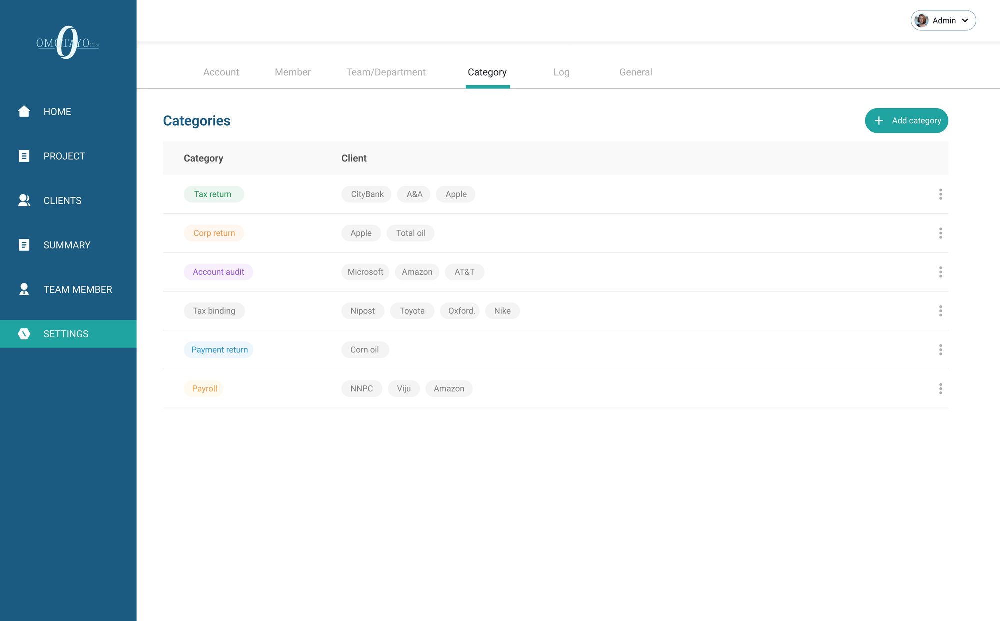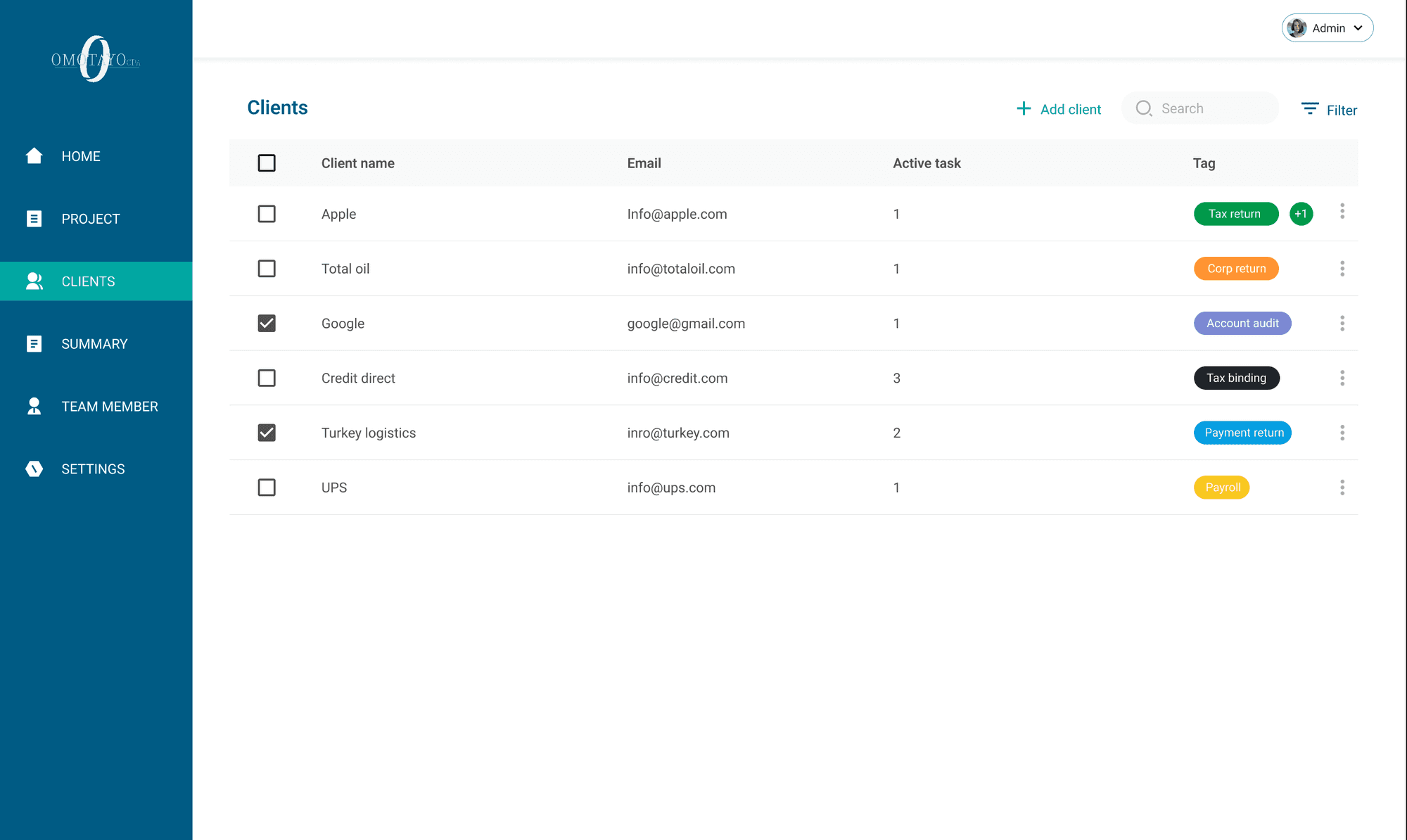 Explore a comprehensive list of company clients, featuring their names, email addresses, and associated tasks. Clients are categorized for seamless identification and sorting, with categories including tax return, corporate return, account audit, tax binding, and more. This organized directory simplifies client management and facilitates efficient task allocation.